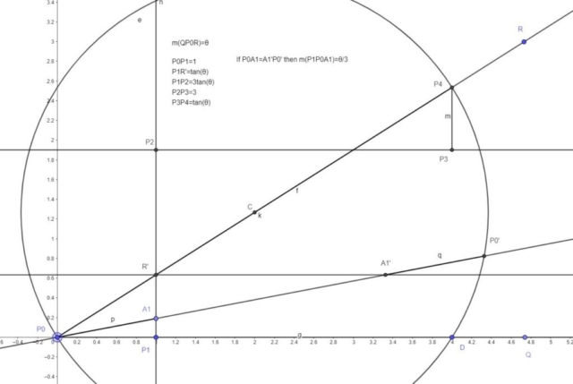 Point A1 is a point somewhere on the segment P1R’. Point A1′ is the intersection between the line passing through P0 and A1 and the perpendicular at point R’. Point P0′ is the intersection between the circle centered at C and the line passing trough the P0 and A1. If P0A1=A1’P0′, then m(QP0A1)=θ/3.