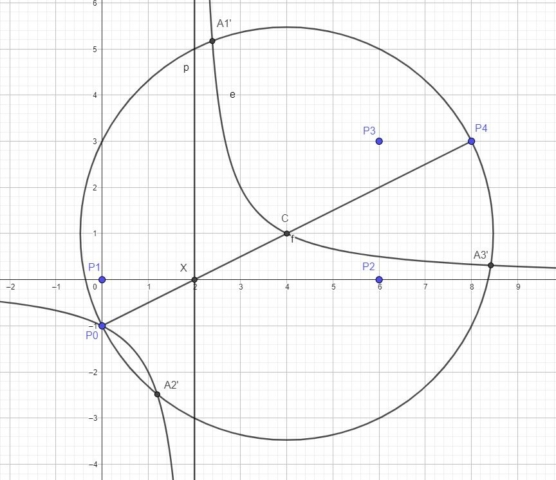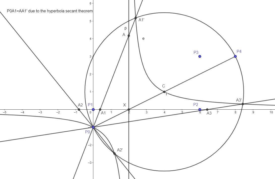 If we let A be the intersection between the line P0A1′ and the perpendicular at X, then P0A1=AA1′ due to the hyperbola secant theorem. Of course, we initially don’t know the location of A1′, A2′ or A3′, so we need to draw random secant lines passing through P0 or C. Using the hyperbola secant theorem you can generate 2 additional points. The 5th point can be generated by reflecting one of the newly discovered points about the point X (as I mentioned above, the point C and P0 are the reflection of each other about point X).