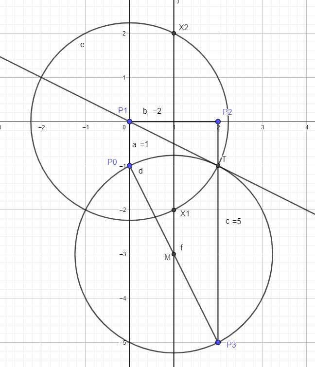 The next step is to create the perpendicular to the segment b from M (the center of Lill’s circle). An alternative is to construct the perpendicular bisector of the segment b. The points X1 and X2 that correspond to the 2 roots, are the points of intersection between the perpendicular bisector and the circle with center at P1 and radius equale to P1T. The coordinates of X1 are (1,-2) and the coordinates of X2 are (1,2). This solves our equation since x1 = 1 – 2i and x2 = 1 +2i (x coordinate gives the real part and the y coordinate gives the complex or imaginary part).